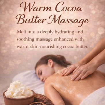 A deeply relaxing, cocoa-infused massage designed to warm the body, soften muscles, and calm the senses. Gentle heat and nourishing cocoa help melt away tension while leaving skin hydrated and the mind at ease. Includes your choice of Rose or Vanilla essential oil. Available in 60min for $135 or 90 minutes for $185 FREE upgrade for members